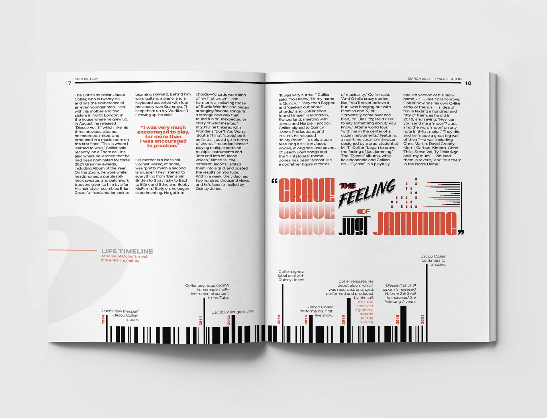 Groove is a jazz magazine that celebrates the history and innovations in jazz. Publication design was created for their "Piano Edition," which highlights young jazz prodigy Jacob Collier. The magazine features monthly top-charts and news segments of all that's new and now.